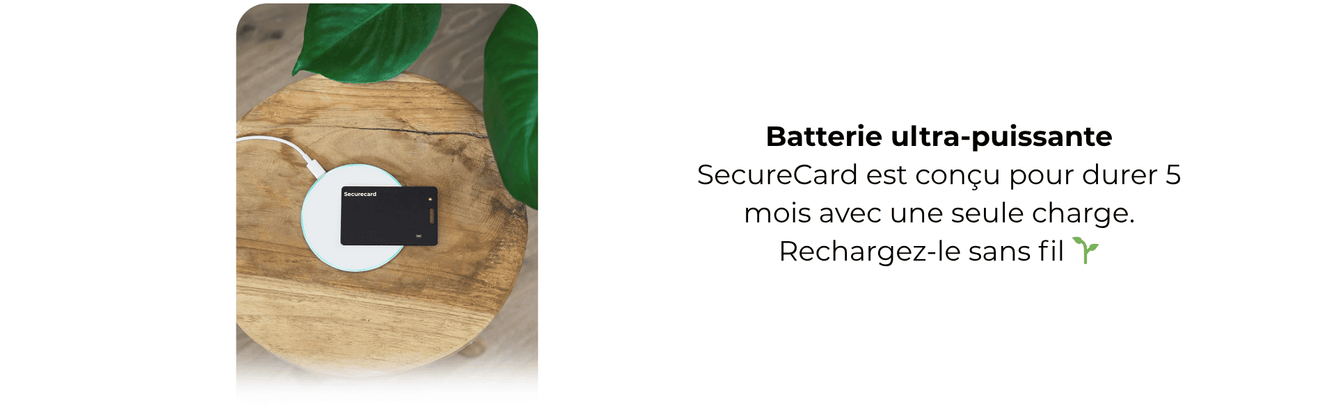 Contrairement aux trackers classiques, SecureCard dispose d’une batterie rechargeable par induction, incluse gratuitement pour toute commande passée avant la fin du chrono.